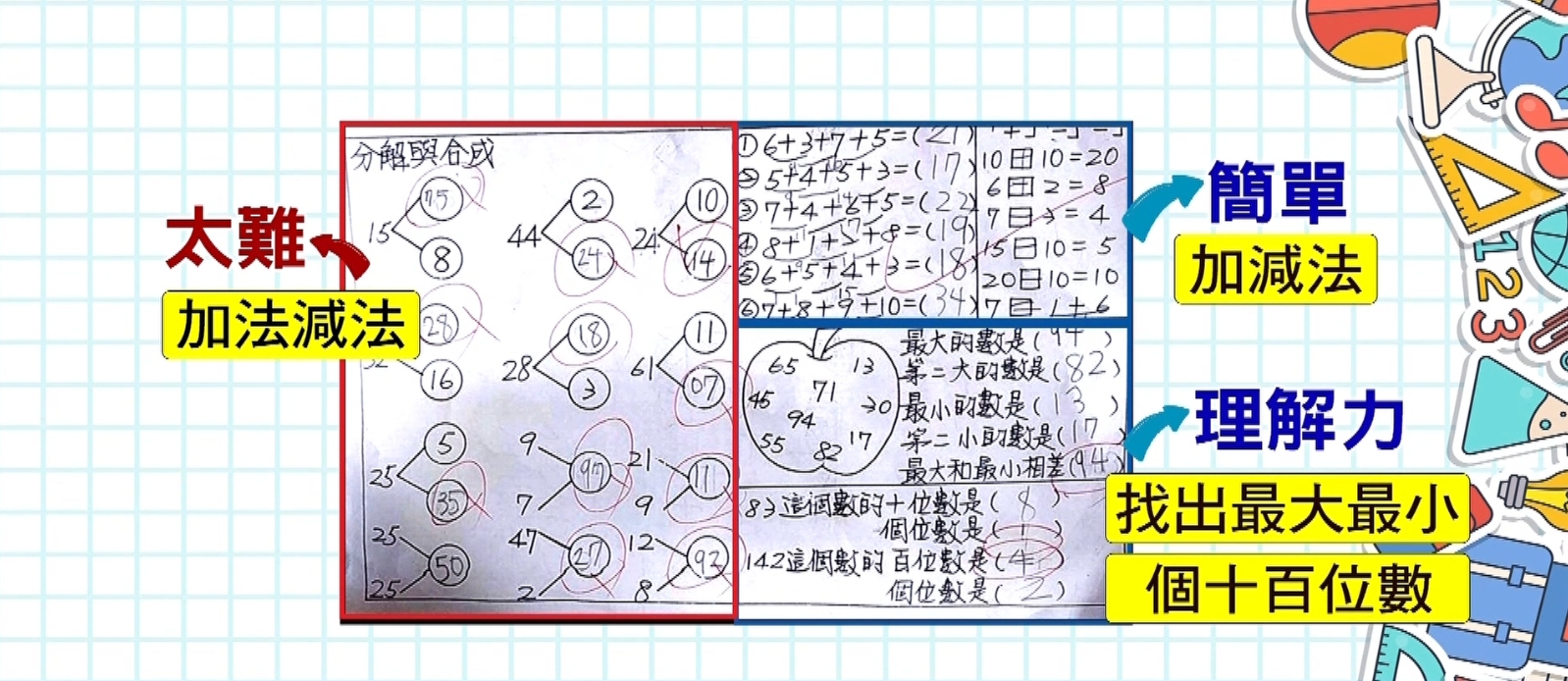 家長向議員投訴,明明才幼兒園大班,但數學考卷卻太難,才讓他邊寫邊哭,看看這張考卷,右半部考的是加減法,找出最大最小數,理解力沒問題就很簡單,不過左半部,題目叫分解與合成,一個數字畫出兩條線,男童慌了看不懂,最後只答對2題 。