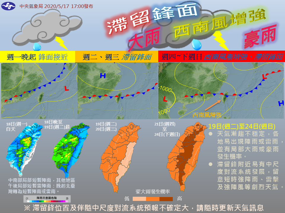 中央氣象局今日於臉書發文,表示雖然今年的第一號颱風「黃蜂」已經解除海上警報,但是重頭戲才正要登場,因為梅雨季第一道滯留性鋒面即將在周二(19日)報到,而且會在台灣附近徘徊好幾天,再加上西南風逐漸增強的情況下,天氣會相當的不穩定。因此周二清晨鋒面接近時,中南部地區需要留意局部短暫陣雨,其他地區則需要注意午後局部短暫雷陣雨,明天開始北台灣則會轉為短暫陣雨或雷雨。