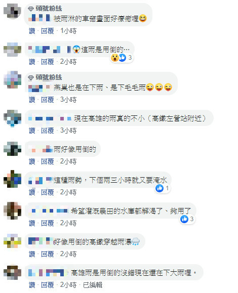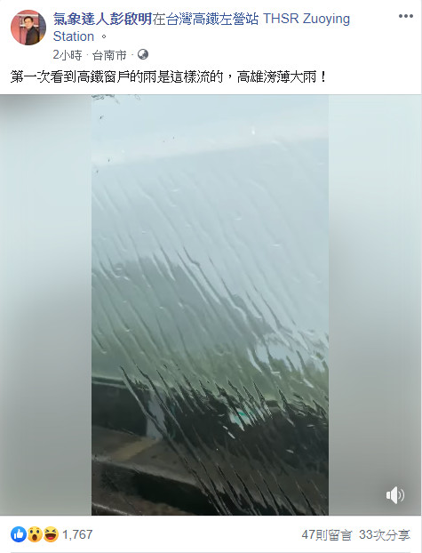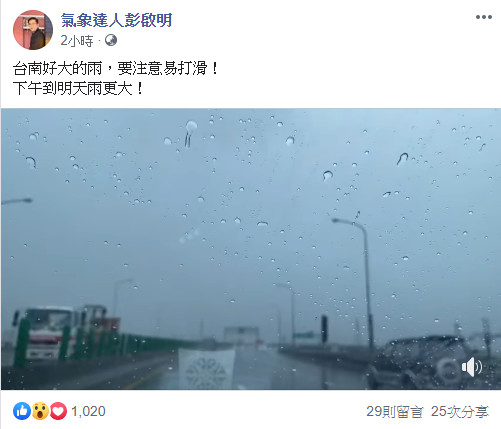 氣象達人彭啟明中午也在臉書PO出影片,指出:「台南好大的雨,要注意易打滑!下午到明天雨更大!」、「第一次看到高鐵窗戶的雨是這樣流的,高雄滂薄大雨!」畫面可見雨勢劇烈,引發網友討論,「這雨是用倒的」、「這種雨勢,下個兩、三小時就又要淹水」、「哇,真的好大喔」、「中南部終於可以解渴了」、「不知什麼時候可以看到太陽」、「希望不要有災情,下到集水區去」、「可怕!雨點很大喔!」