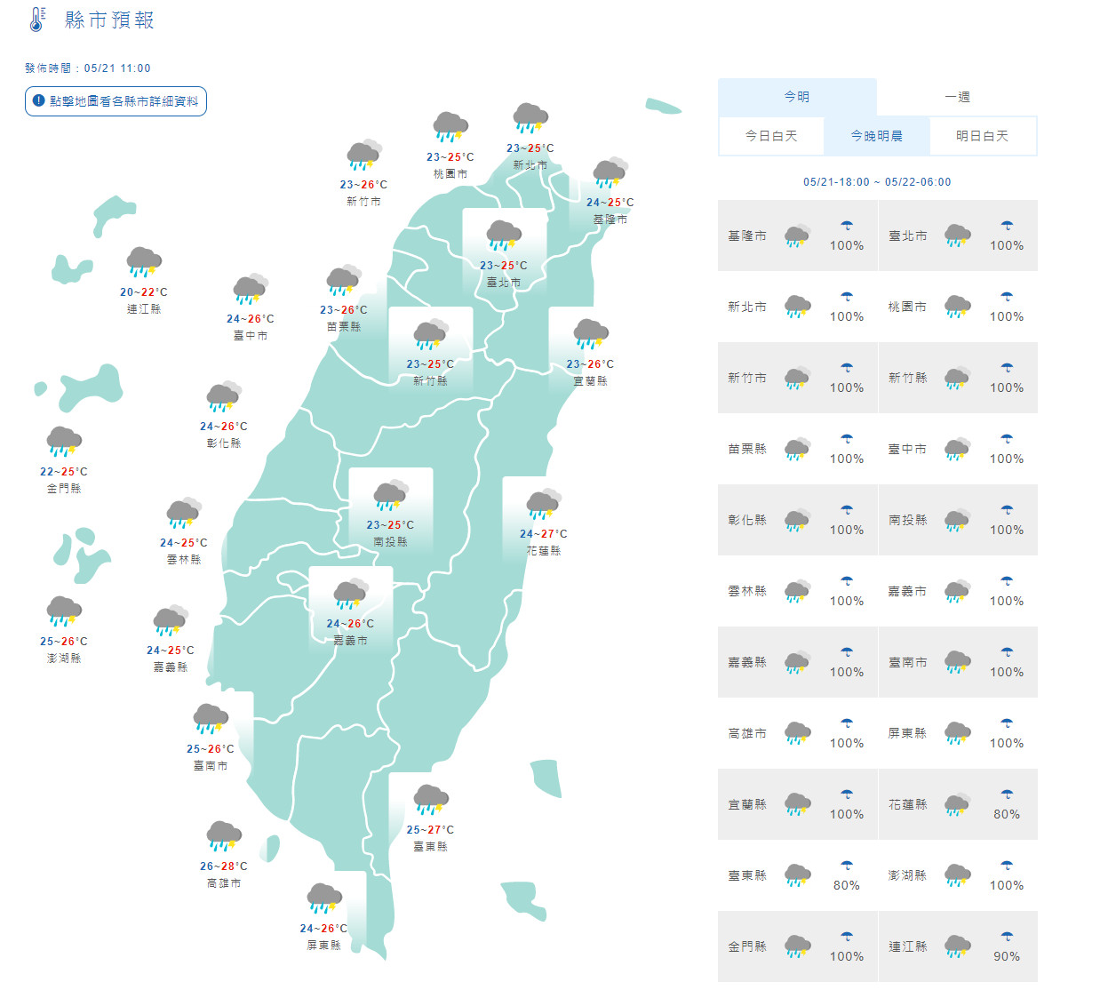 滯留鋒面影響,今(21)日高雄市、屏東縣、臺東縣山區有局部大雨或豪雨,基隆北海岸、南投、嘉義、臺南、宜蘭、臺東、澎湖地區及中部山區有局部大雨發生的機率,提醒民眾注意雷擊、強陣風及溪水暴漲,低窪地區請慎防淹水,山區請注意坍方及落石。