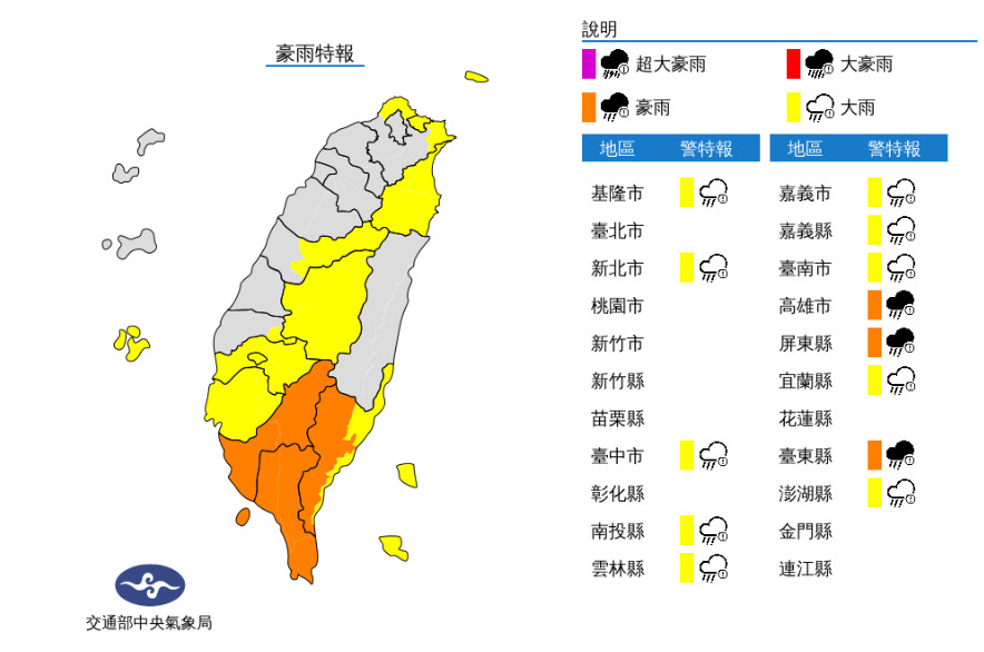氣象局表示,今日下午到明日一整天,將是這波雨勢最大最明顯的時候,全台各地都有機會出現短時強降雨,中部、南部有豪雨等級以上的降雨,其他地方有局部大雨或豪雨發生的機會,提醒對流通過的時候,雷雨胞除了帶來比較強的降雨外,也可能會伴隨強陣風、雷擊的現象。