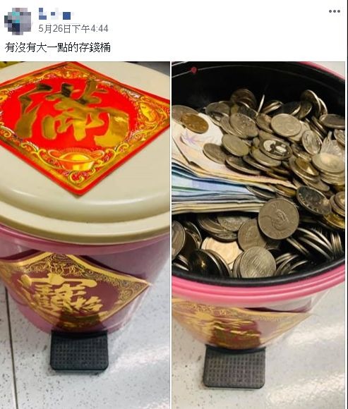 近期一名網友在臉書社團「爆廢公社」貼出兩張圖,第一張為貼上兩張春聯的粉色塑膠垃圾桶,沒想到將它打開後,卻驚見滿滿的金山銀山,千鈔百鈔紙幣應有盡有,完美演繹什麼叫做「外表看似普通,內容異於常人」這段話。