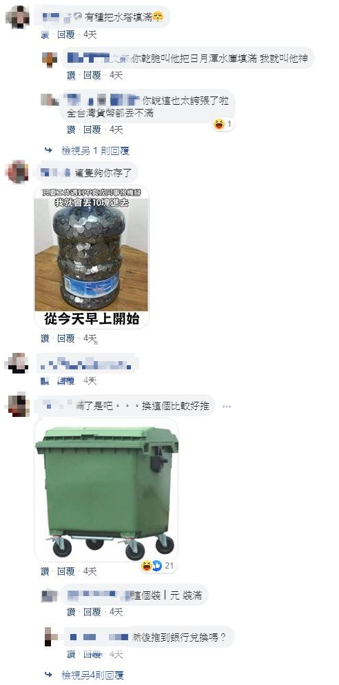 除了讚嘆原PO的存錢功力外,也有網友幽默回應道「有種把水塔填滿」、「我等等先幫你載回家分類」、「我環保局的...你的垃圾違規了」、「小偷闖空門絕對不會發現垃圾桶裡有錢」、「我幫你丟垃圾」 、「連個垃圾桶都比我有錢」。
