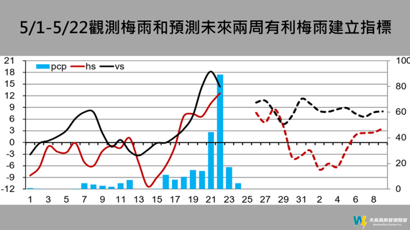 事實上,先前災害預報士賈新興曾提出,今年算是本(5)月18日入梅,1日-22日實際觀測顯示,18日後兩個指標同時轉為正值,並持續了一段時間,因此似乎可以認定18日為入梅的時間點,不過台灣梅雨降雨雖然從7日開始就有持續性降雨,但雨量並不顯著,而且指標那時還沒建立,「降雨的峰值和紅色的正渦度線鋒值也都搭配上」。