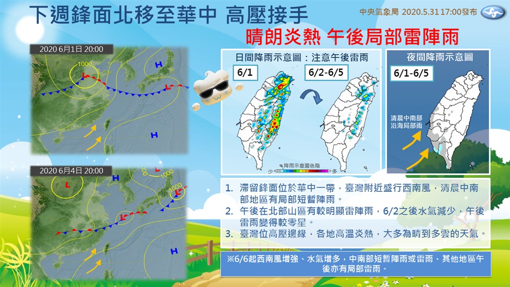 不過鄭明典也提醒,連續艷陽高照的日子已經來臨,6月1日至5日,因台灣位於副熱帶高壓西北側,主要受西南風影響,大多為炎熱穩定且晴朗的天氣,清晨中南部沿海有局部雨;午後雷陣雨集中在近山區,北部、東北部及東部地區較明顯,6月2日後水氣減少,午後雷陣雨範圍較零星;6月5日水氣又稍微增加,6月6日,原位於華中一帶的鋒面南移,台灣附近西南風增強,屆時水氣又增多。