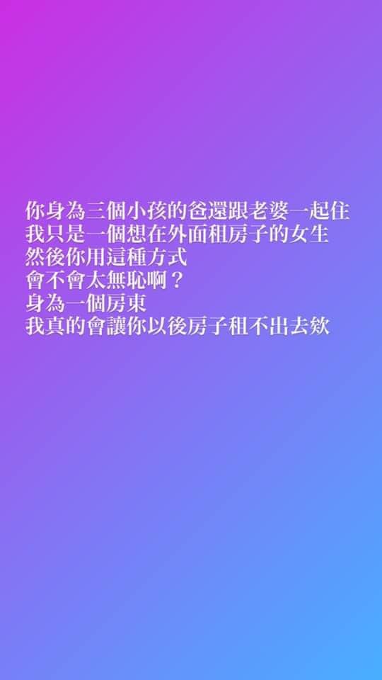 女大生這時才驚覺,房東所謂的「打工換住宿」,是要她獻身陪睡的意思,嚇得向友人求助,事後還在IG發文,痛批:「你身為3個小孩的爸,還跟老婆一起住,我只是一個想在外面租房子的女生,然後你用這種方式會不會太無恥啊?身為一個房東,我真的會讓你以後房子租不出去欸」。