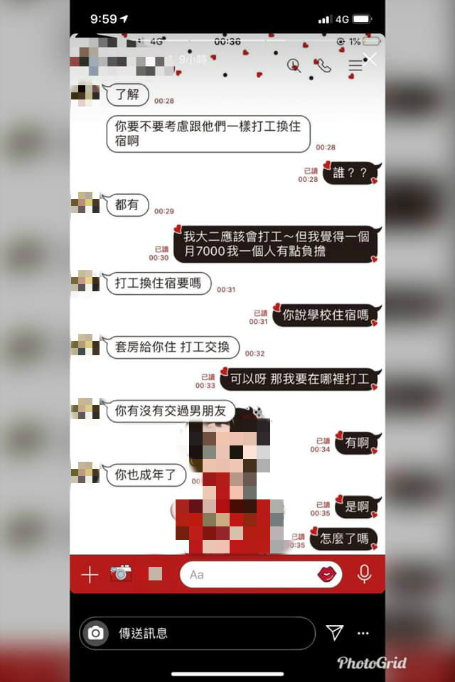 在外租屋要注意安全!一名女大生近日在台北找租屋,沒想到房東竟要求「打工換住宿」,她原本以為只是單純的打工,但房東後來直接點破「陪我」,更開條件「一個月一次就好」,露骨對話嚇得她將對方封鎖並提告性騷擾。對此,房東也出面回應了。