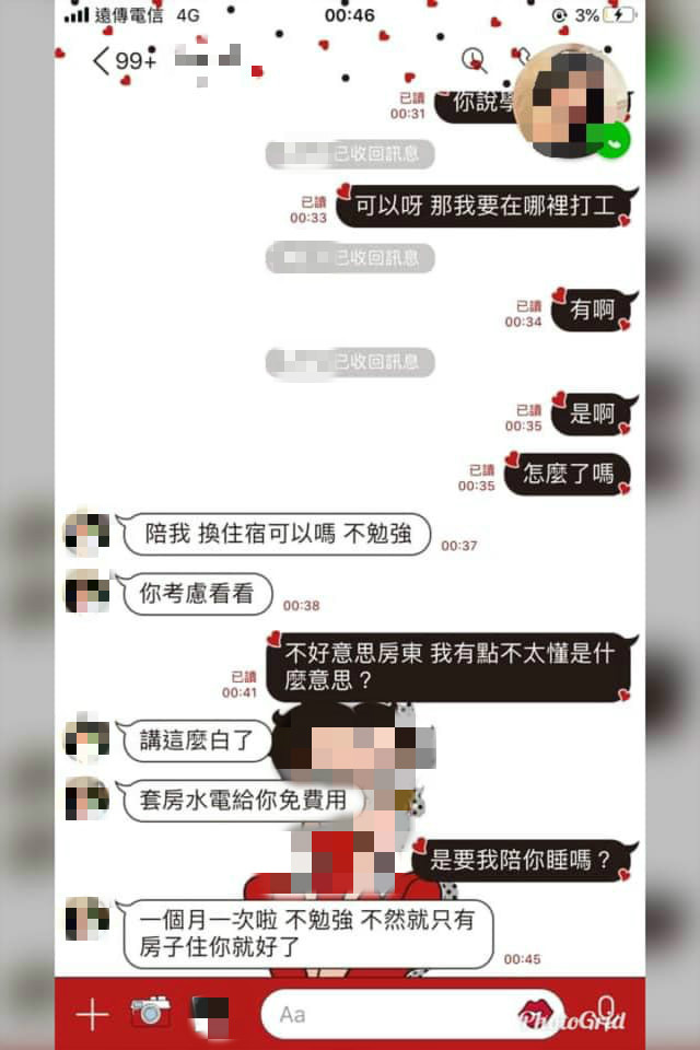 豈料房東話鋒一轉,突然問起私事,「妳有沒有交過男朋友」、「妳也成年了」,女大生回答:「是啊,怎麼了嗎?」這時房東突然將上面的對話收回,直接開門見山:「陪我換住宿可以嗎?不勉強,妳考慮看看」,但女大生仍一頭霧水,追問:「不好意思房東,我有點不太懂是什麼意思」,房東有點失去耐心,直說:「講這麼白了,套房水電給妳免費用,一個月一次啦,不勉強」。