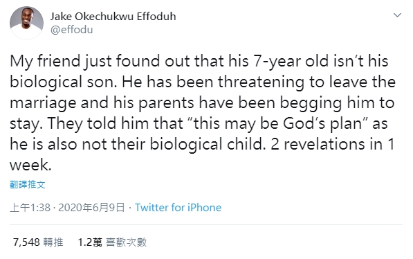近日奈及利亞發生了一起宛如電視劇情節的離奇事件,知名的節目主持人艾菲特(Jake Okechukwu Effoduh)在推特上po出了一段發生在朋友身上的真實案例,事情發生經過「精彩」到讓1萬多名網友按讚留言,引起大家討論,艾菲特表示「我的朋友剛剛發現他7歲的兒子不是親生的」,接著說對方在發現了這個驚人事實後,一直威脅想和老婆離婚。