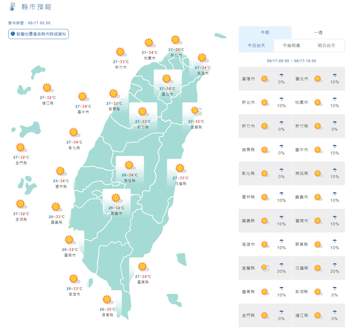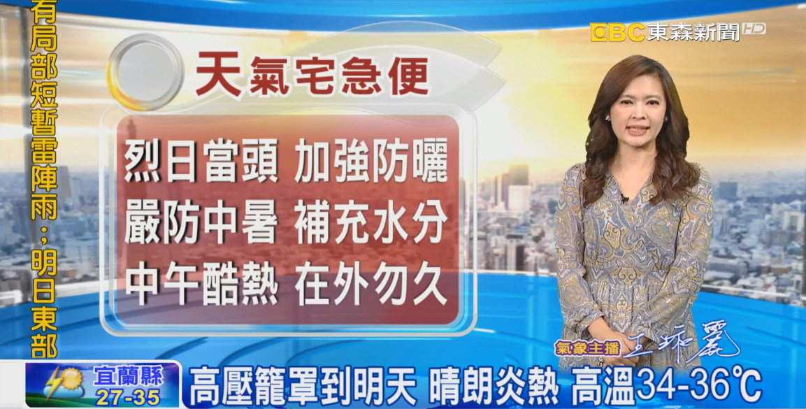 中央氣象局表示,今日太平洋高壓持續籠罩,台灣附近吹著乾燥的西南風,各地為晴到多雲,午後在山區仍會有局部熱對流發展,但影響範圍有限;氣溫方面,持續是盛夏炎熱的天氣型態,各地高溫皆在33度以上,花蓮縱谷局部地區有可能出現38度以上的極端高溫,氣象局也發布紅色高溫燈號,提醒注意熱傷害,另外,由於雲量偏少,紫外線指數易達過量甚至危險級,外出活動請注意防曬並多補充水份。