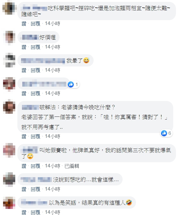 這則貼文曝光後,引來大批網友留言,「她有16個選項耶,你脾氣好好,最後她選隨便」、「都説隨便了,幹嘛還一個個問,自己決定好買下去就對了,只要注意不要買到老婆吃了會過敏的食物就好了」、「這老公脾氣太好太有耐性,什麼星座」、「金牛,我的內心常常這樣自己跟自己對話」,也有網友提供這種情況的解決方法,「老婆猜猜今晚吃什麼?老婆回答了第一個答案就說:『哇!妳真厲害!猜對了!』就不用再考慮了」。