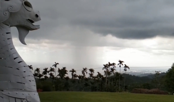連假第2天,午後對流旺盛,雲林各地都出現午後短暫強降雨,有民眾在古坑華山就拍下整片的雨瀑奇景,雲雨一起移動掃過草地,就像移動式瀑布景象非常壯觀。