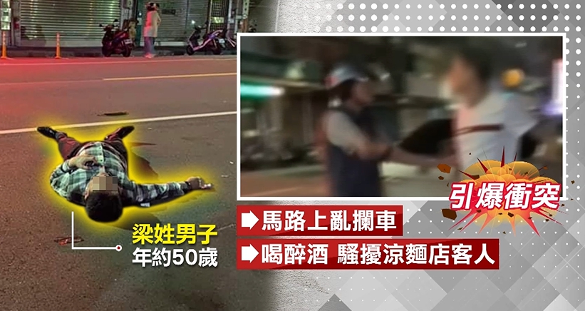 原來年約50歲的梁姓男子晚上和朋友狂歡喝酒後,回家前突然很想吃涼麵,然而他到店門外,不只在馬路上隨機亂攔路過的車輛,還因為實在太醉,不斷騷擾涼麵店的客人,一對情侶在店內被他煩的受不了,衝突一觸即發。