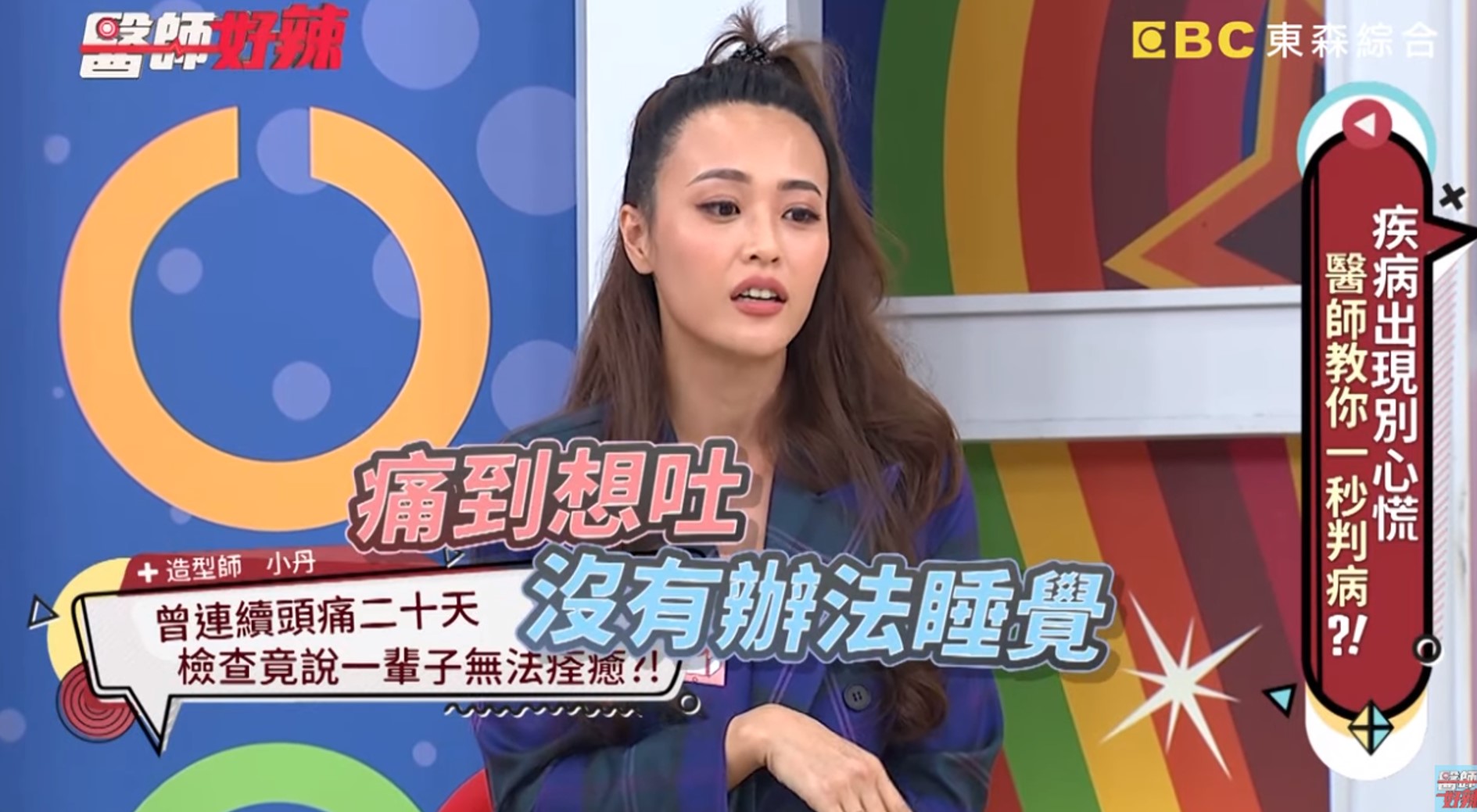 造型師小丹日前上節目《醫師好辣》,透露自己有慣性的頭痛症狀,表示「我的綽號是頭痛王,我超容易頭痛,都痛右邊」,說明自己巔峰時期,一個月可以痛20天,且5至7天吃止痛藥也毫無效用,小丹也透露當時痛到想吐,完全沒辦法睡覺,直到同樣的情形發生第二次後,自己才驚覺有些不對勁,立刻前往醫院看診,才知道自己因為受到基因遺傳,所以有典型的偏頭痛症狀。