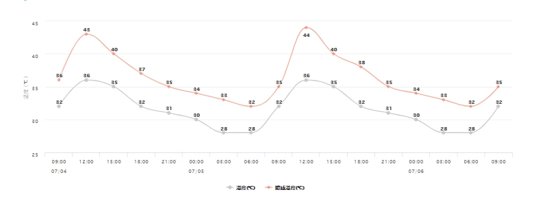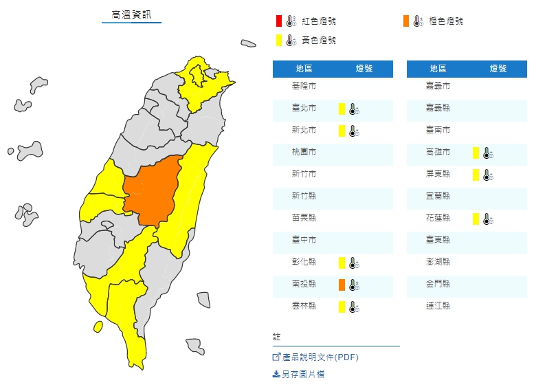 另外氣象局也針對8縣市發布高溫警戒,中午前後南投縣近山區或河谷為橙色燈號,有連續出現36度高溫的機率,請加強注意。花蓮縣縱谷,台北市及新北市地區,彰化縣、雲林縣、高雄市、屏東縣近山區或河谷為黃色燈號,請注意。另外,氣象局鄉鎮預報資料也顯示,台北市中正區4日的體感溫度最高恐達43度。