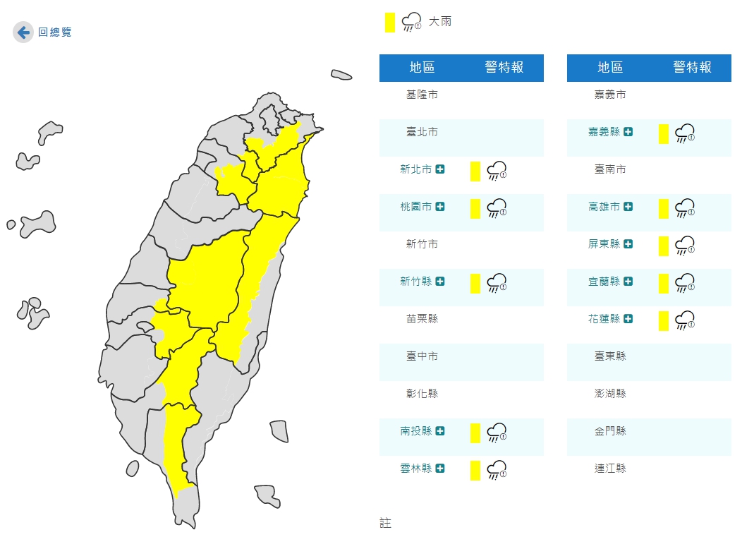 ▼氣象局於今日針對10個縣市發布大雨特報,提醒民眾注意大雨發生。(圖/翻攝自中央氣象局)