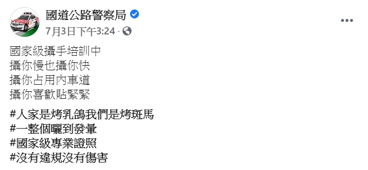 國道公路警察局3日在臉書曬出幾張培訓照片,並寫下「國家級攝手培訓中」,解釋他們正在訓練警察使用雷射測速槍,更搞笑表示「攝你慢也攝你快、攝你占用內車道、攝你喜歡貼緊緊」,雖然沒有明說,但言下之意就是提醒用路人遵守交通規則,幽默發言引起許多網友討論。