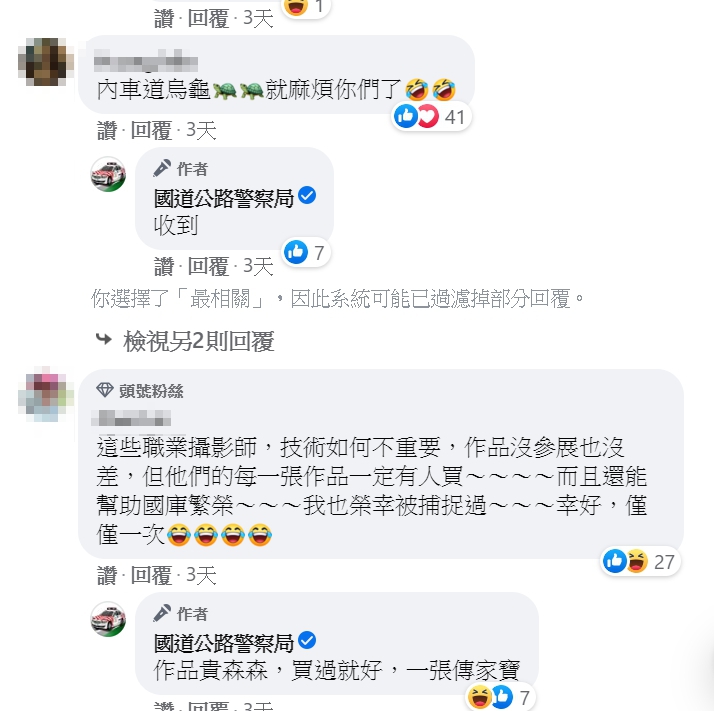 更有網友說,這些職業攝影師技術如何不重要,作品沒參展也沒差,因為他們每一張照片都一定有人買,甚至笑說「還能幫助國庫繁榮」,網友們的熱烈回應也意外釣出國道公路警察局的小編現身,小編風趣表示「作品貴森森,買過就好,一張傳家寶」、「一張作品3千起跳喔」;根據《道路交通管理處罰條例》,汽車行駛於高速公路、快速公路或設站管制之道路,不遵交通規則將面臨新臺幣3千元以上6千元以下的罰鍰。