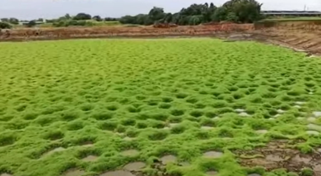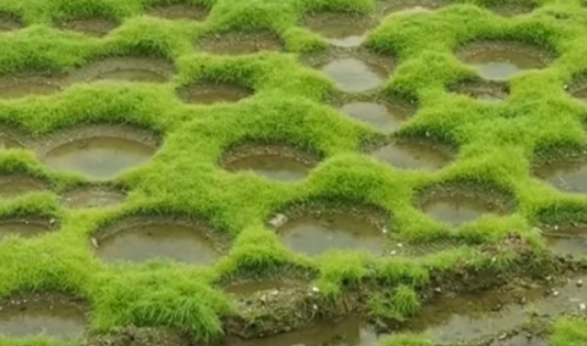 嘉義縣農業處漁業科指出,一般魚塭池底會累積魚的排泄物,魚塭收成後,養殖民眾會整池曝曬,以推土機或怪手翻鬆表層土,曬池1到2週以上,為新一季的養殖做準備,形成「洞洞草原」魚塭剛好還沒有整池,可能遇到雨水或池底潮濕,而長出綠油油的草。