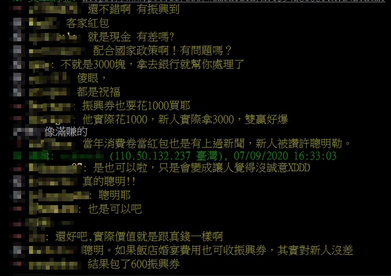 ▼網友表示,朋友遇到一對新婚夫妻,該對夫妻的親友竟然想直接拿三倍券當紅包送他們。(圖/翻攝自ptt)