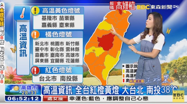 溫度方面,各地依舊高溫炎熱,高溫普遍在33至36度,其中大台北盆地及南投地區有局部38度左右的高溫,花東縱谷及宜蘭、西半部較內陸的平地也有局部36度以上高溫出現的機率。因此,東森氣象主播王淑麗也指出,白天高溫「紅色燈號」的地區有台北市、南投縣,有連續出現38度極端高溫的機率;「橙色燈號」的地區有新北市、桃園市、新竹縣、台中市、彰化縣、雲林縣、嘉義市、台南市、高雄市、屏東縣、宜蘭縣及花蓮縣,可能發生38度極端高溫;而「黃色燈號」的地區有基隆市、苗栗縣、嘉義縣及台東縣。