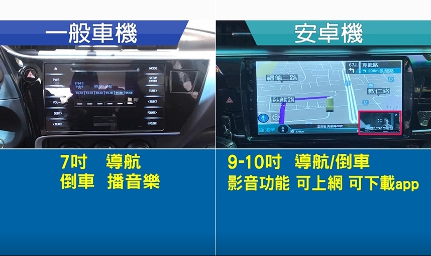 汽車車機改裝安卓機,依車款不同、價位也不同,從數千元到數萬元不等,雖然危險性有,但螢幕變大了,導航功能跟倒車看的更清楚,但國內外各大車廠都沒有這樣規格,除了怕造成危險,也不符合交通法規。