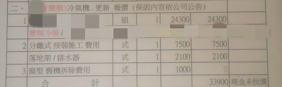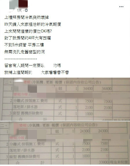▼A牌子的冷氣報價要4萬4000元。(圖/翻攝自臉書社團「爆怨公社」)