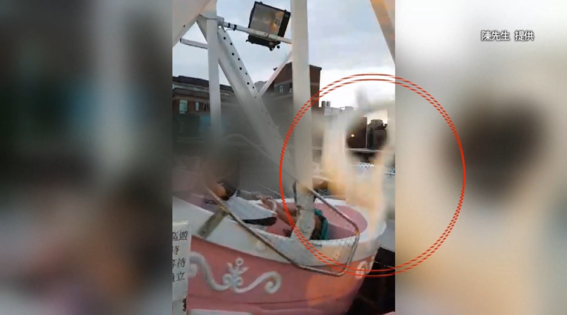 海盜船晃啊晃,小朋友乖乖坐在上頭,爸爸陳先生拿手機拍攝,但沒幾秒鐘時間,碰的一聲好驚險,因為從天而降掉下來的居然是一塊超大鐵製設施零件,現場大人小朋友通通嚇壞了。