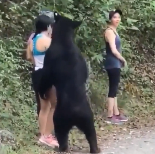 據《infobae》網站報導,3名女子在奇皮克生態公園運動時遇到了黑熊便停止運動,其中一位,似乎不想和黑熊正面接觸,整個人轉過身背對著黑熊,另名戴帽子的女子,則已經往前走開,遠遠的離開「搖滾區」,但也不時回頭注意後面的動靜,其中一名背心短褲女子,更直接和黑熊近距離接觸,只見黑熊緩緩接近穿著藍上衣的女子,接著直立身來東聞聞西嗅嗅女子的身體,之後還抓了女子大腿一下,害得女子踉蹌一下,原以為黑熊就這樣結束牠的好奇之旅,沒想到牠來個回馬槍,再度直立起身子靠近藍衣女子,沒想到女子居然還不慌不忙地拿出手機跟黑熊來一張合照。