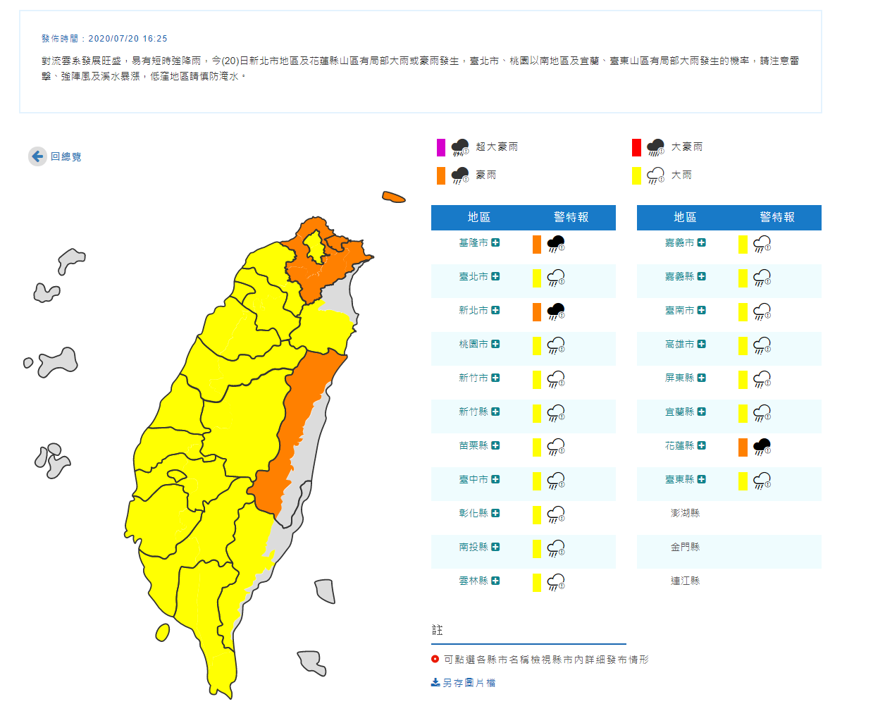 中央氣象局於今(20日)發布豪雨特報,因對流雲系發展旺盛,易有短時強降雨,今日新北市地區及花蓮縣山區有局部大雨或豪雨發生,臺北市、桃園以南地區及宜蘭、臺東山區有局部大雨發生的機率,請注意雷擊、強陣風及溪水暴漲,低窪地區請慎防淹水。