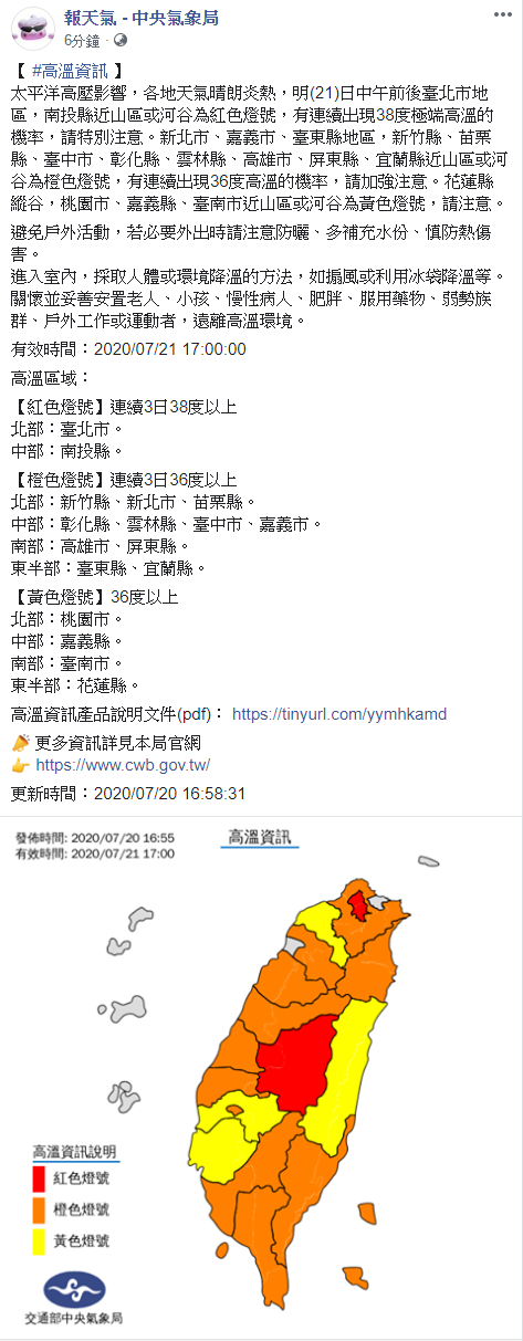 不只豪雨需要注意!氣象局也在臉書專頁上寫下高溫資訊,由於太平洋高壓影響,各地天氣晴朗炎熱,明(21)日中午前後臺北市地區,南投縣近山區或河谷為紅色燈號,有連續出現38度極端高溫的機率,請特別注意。新北市、嘉義市、臺東縣地區,新竹縣、苗栗縣、臺中市、彰化縣、雲林縣、高雄市、屏東縣、宜蘭縣近山區或河谷為橙色燈號,有連續出現36度高溫的機率,請加強注意。花蓮縣縱谷,桃園市、嘉義縣、臺南市近山區或河谷為黃色燈號,請注意。