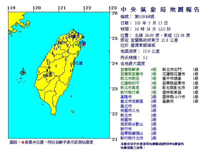 地震最新消息,今(13)日16時24分,發生芮氏規模5.1有感地震,震央位置在宜蘭縣政府東方 21.8 公里 (位於臺灣東部海域),震源深度15.9公里。