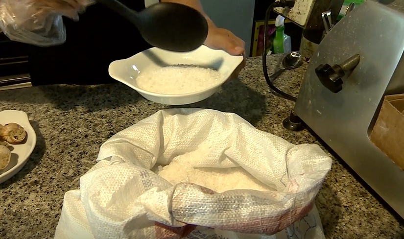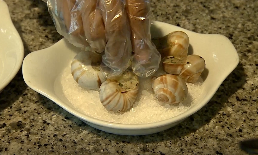 轉個鏡頭看,這一大袋粗鹽,我們拿到的是食品加工用的,鋪在烤田螺下方,除了裝飾,最主要能保溫,這法式烤田螺底下鋪的一層食品級粗鹽,儘管餐廳不建議客人食用,但它也絕對不能用工業用的鹽,因為它與食物本身是如此的貼近。