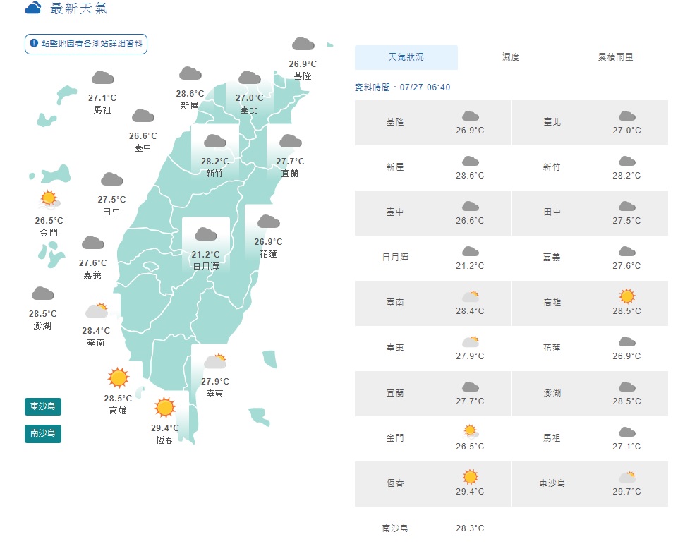 今(27)日中南部地區有局部短暫陣雨或雷雨,午後各地仍要留意局部短暫雷陣雨,其中在各地山區及西半部地區有局部大雨發生的機率。氣溫方面,各地仍悶熱,普遍達33至35度,其中大台北、西半部近山區平地或河谷及花蓮縱谷,仍可能有36度以上高溫。