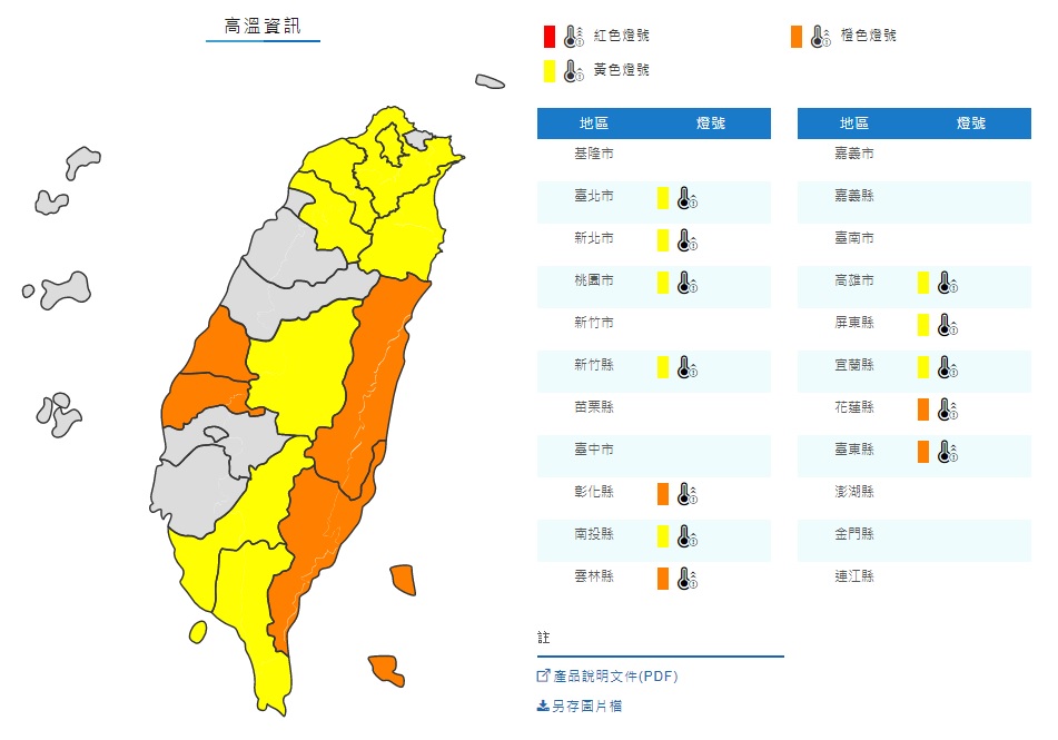 ▼全台多縣市亮高溫燈號。(圖/翻攝自中央氣象局)