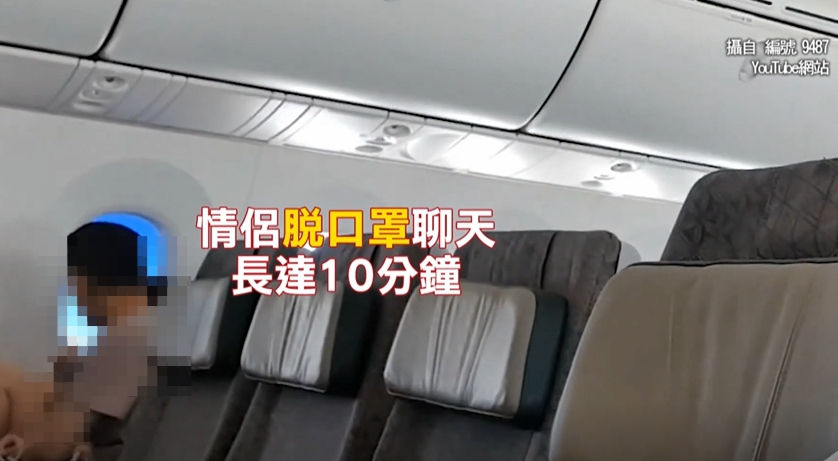▼一名從日本搭機回台的民眾直擊,同機一對情侶摘下口罩聊天。(圖/翻攝自編號9487YT頻道/東森新聞)