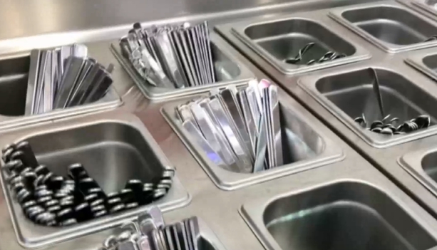 美式賣場捨棄一次性免洗餐具,改用環保餐具,網友也好奇,這樣餐具會不會被人帶回家?記者實際到現場觀察,民眾用完餐都會自動幫忙回收,而且因為使用過的餐盤會油膩,幾乎沒人把它帶出賣場。面對網友的提問,美式賣場也回應,改用環保餐具後,沒有特別統計,有沒有少環保餐盤、刀叉,也秉持相信會員的態度,不會請店員特別監視餐具使用狀況,如果真的發現有消費者隨手帶走,也會友善提醒,環保餐具用完請留下。