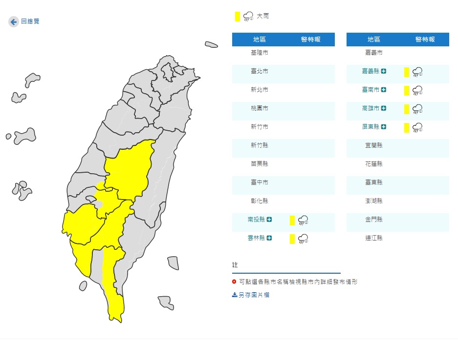 因對流雲系發展旺盛,易有短時強降雨,今(1)日恆春半島、南投、臺南、高雄地區及雲林、嘉義、屏東山區有局部大雨發生的機率,請注意雷擊、強陣風及溪水暴漲。