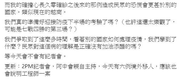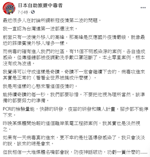 ▼林氏璧認為,一開始只出現零星的本土案例,我國根本還沒發生第一波疫情爆發。(圖/翻攝自日本自助旅遊中毒者臉書)
