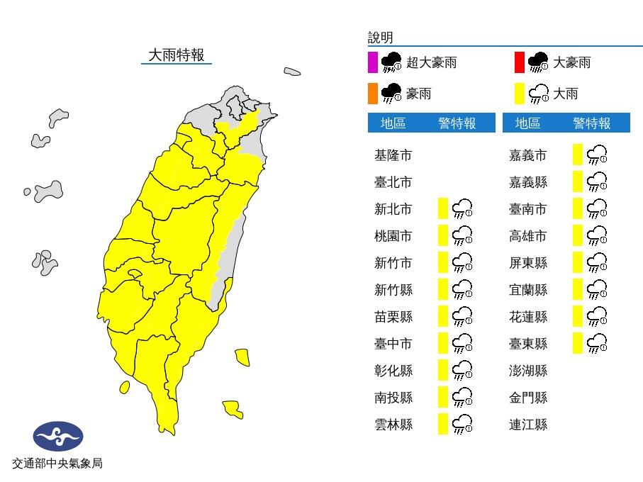 大雨特報地區包含新北市、桃園市、新竹縣、新竹市、苗栗縣、台中市、彰化縣、南投縣、雲林縣、嘉義縣、嘉義市、台南市、高雄市、屏東縣、宜蘭縣、花蓮縣及台東縣。