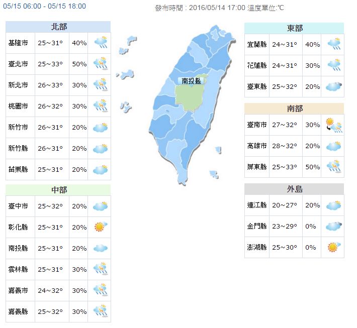 氣溫方面,各地高溫還是有31到33度,感覺上較為悶熱,在戶外要注意防曬並多補充水分,而夜間各地低溫大多在24、25度附近。