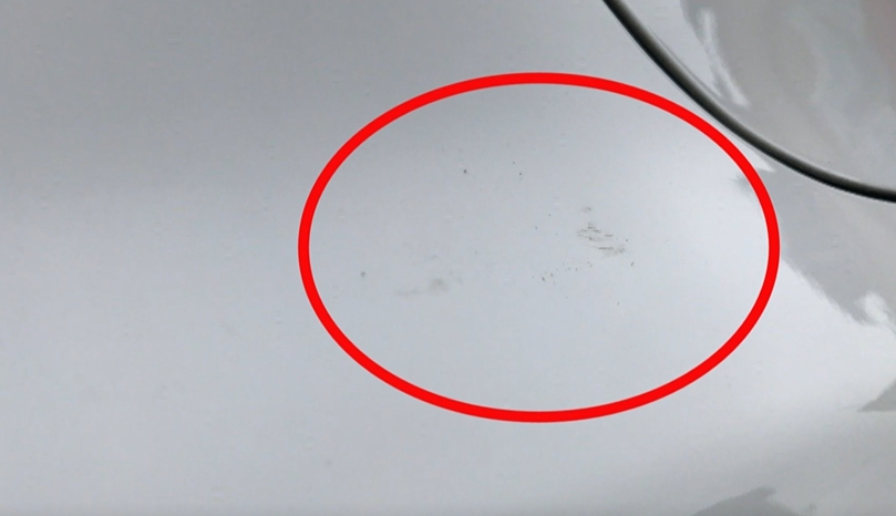 ▼白色車子在修復過後車身還是有一些明顯刮痕,事後車主調閱行車紀錄器,懷疑是站在堤防上的孩童丟擲石頭。(圖/東森新聞)