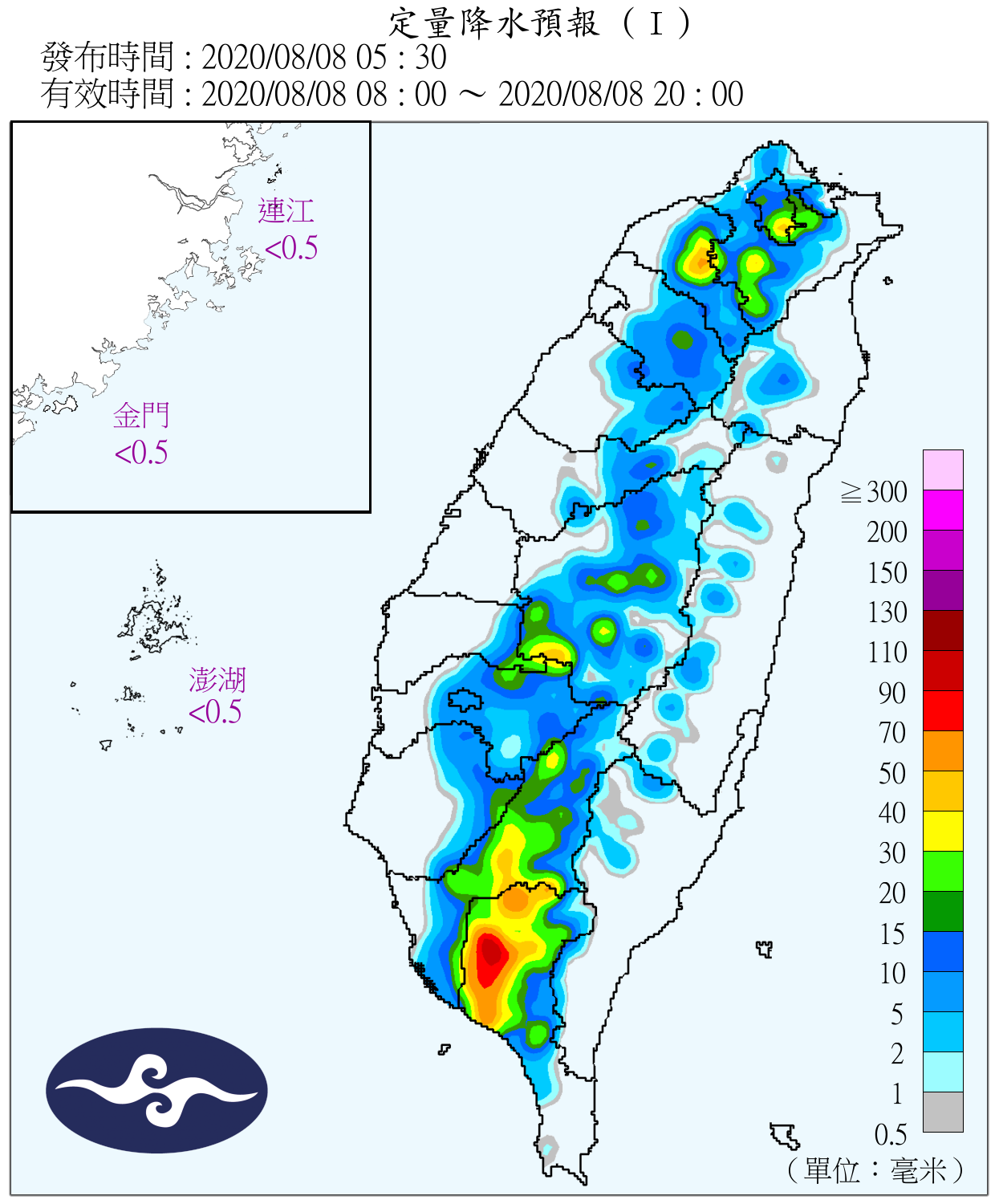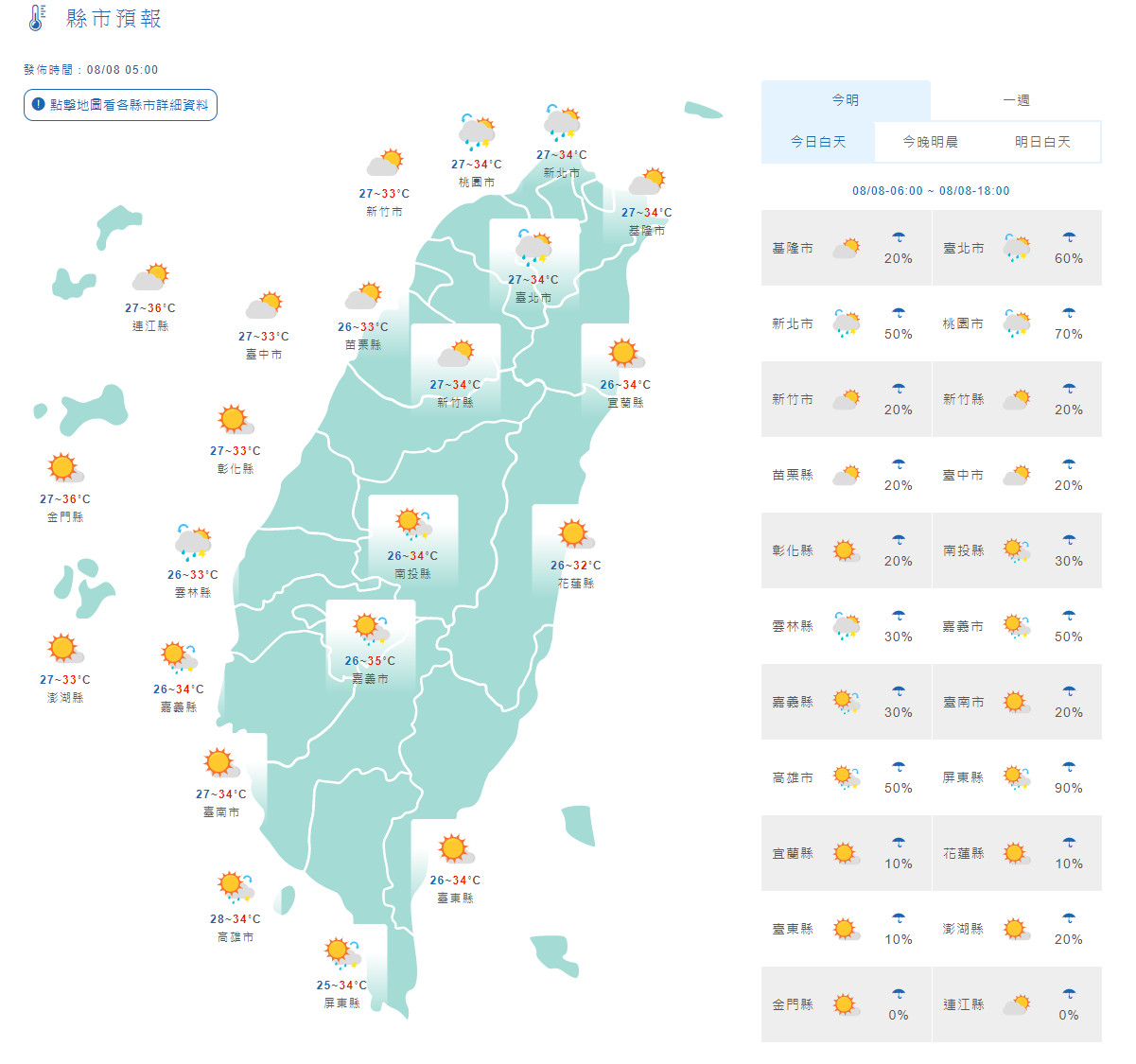中央氣象局表示,今日台灣各地大多為多雲到晴,但午後雷陣雨的範圍稍增,西半部地區及東半部山區需留意午後局部短暫雷陣雨,並有局部較大雨勢發生的機率,清晨至上午西半部地區亦有零星短暫陣雨,外出請攜帶雨具備用;各地白天高溫多在33至35度,大台北、嘉義、台南及金門、馬祖有局部36度以上高溫發生的機率,外出請注意防曬並多補充水分。