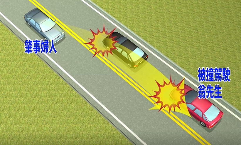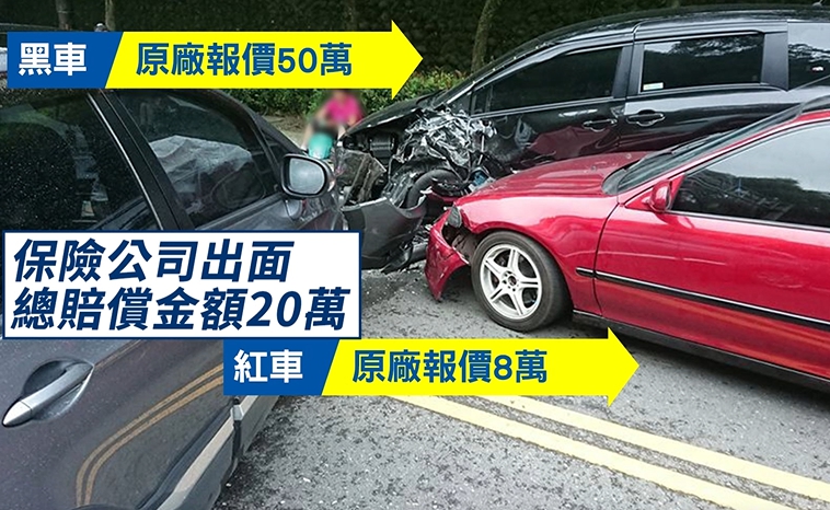 車禍發生在5月份,翁先生的前車是直行,婦人駕駛的灰色轎車橫越雙黃線,才會先撞黑車再撞翁先生的紅色轎車,兩輛車經過原廠報價,維修費分別是50萬和8萬,發生車禍已經夠倒楣,和肇事婦人談理賠 ,還很傷腦筋。