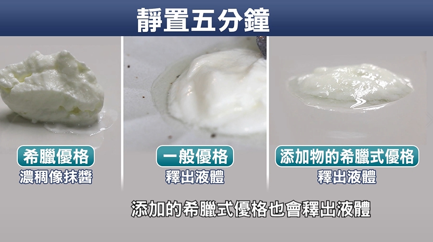靜置五分鐘,希臘優格依舊濃稠,一般優格會釋出水狀乳清,添加的希臘式優格也會釋出液體,廠商們也為了避免名稱引發消費爭議,命名為「希臘『式』優格」,靠著行銷噱頭來創造更大利潤誤導消費者。