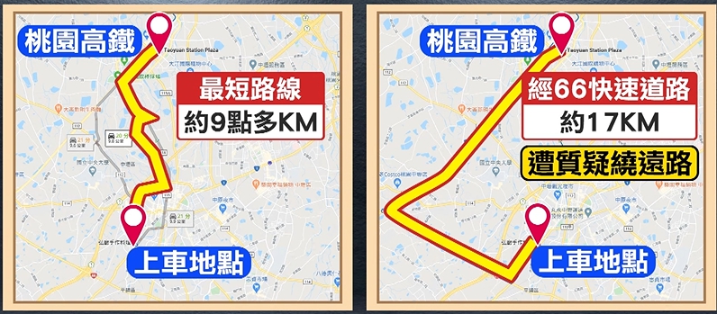 其他司機還把當事司機的影片,轉PO上臉書爆系社團,也有不少人認為司機確實有繞路嫌疑,從乘客上車地點,如果走最短路線約9點多公里,但是走司機當時走的經過66快速道路卻要17公里,多了至少8公里左右才會被質疑繞遠路,實際找其他桃園高鐵站司機,他們說如果要走快速道路,事前一定要跟乘客說清楚。