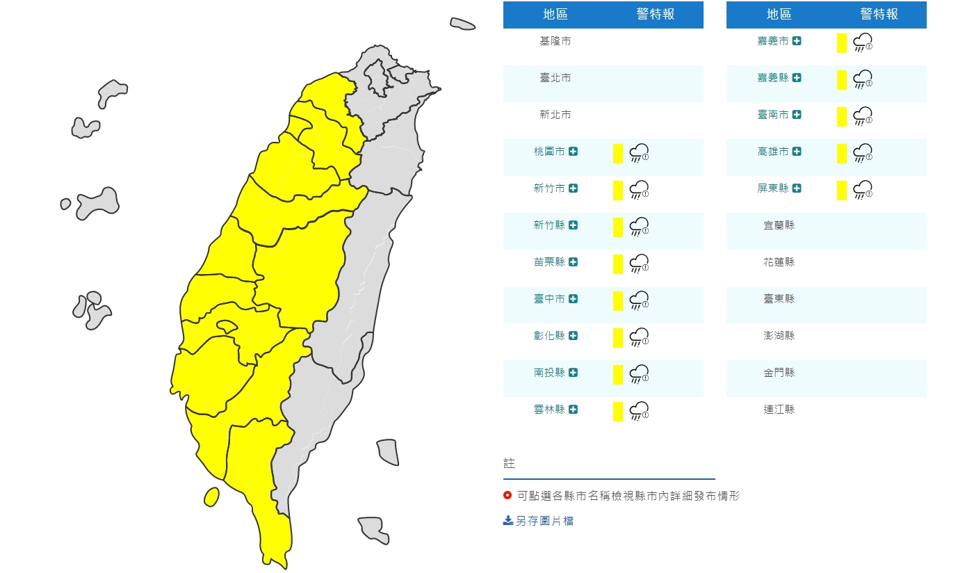 ▼中央氣象局特別對全台13縣市發布大雨特報。(圖/翻攝自中央氣象局)