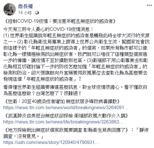 不只彰化縣長表態,台大公衛教授詹長權也在臉書發文,分析3大關鍵,第一,世界衛生組織說年輕且無症狀的感染者,是觸發此時全球大流行的來源之一,第二,彰化縣衛生局專業上跟得上世界公共衛生主流,幫國家社會找到這樣子的「年輕且無症狀的感染者的個案」,如果所有縣市都可以像彰化縣一樣積極檢測找出無症狀者,就可以堵住這種類型個案進一步的傳播,讓疫情不至於擴散到社區,第三,衛福部不用公衛專業,去和彰化縣相互切磋討論下一步防疫如何加強,反而大張旗鼓宣稱,要用政風單位去查彰化縣政府為何要去發現「年輕且無症狀的感染者」;詹長權也在文末坦言「不懂政府為何要這樣做?台灣怎麼了?很難過!」