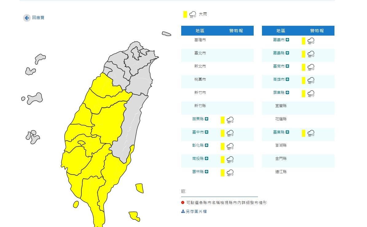 ▼中央氣象局針對全台11個縣市發布大雨特報。(圖/翻攝自中央氣象局)