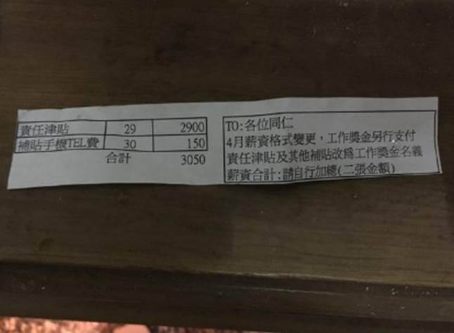 一名網友在臉書社團「爆料公社」PO出薪水條照片,上班天數29天,底薪為15950元,其中包括加班費、伙食津貼、交通津貼、外勤津貼等,請一天事假,雇主提繳勞健保勞退3529元等,總計應有25918元。